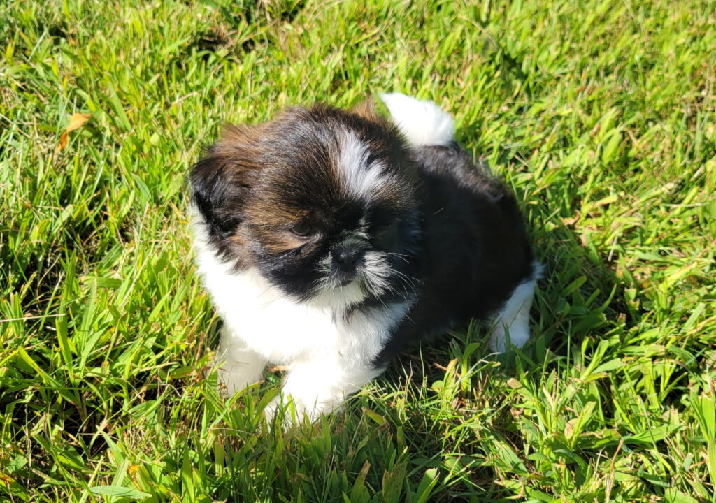Biscuit is a black-and-white male Shih Tzu with short white socks and a white chest. Expected to reach 10-16 pounds, he’s absolutely adorable.
