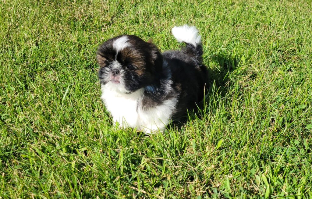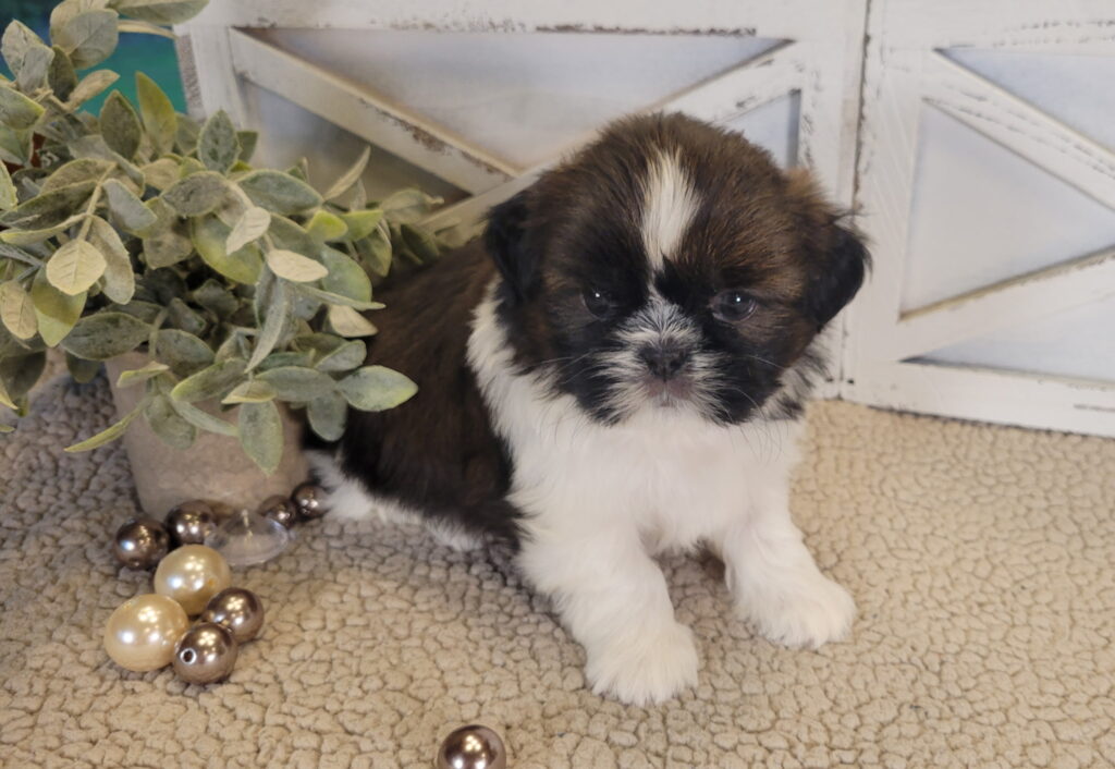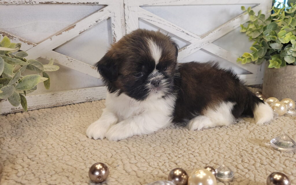 Butterball is a black-and-white male Shih Tzu with tall white socks and a white chest. Expected to reach 10-16 pounds, he’s irresistibly charming.