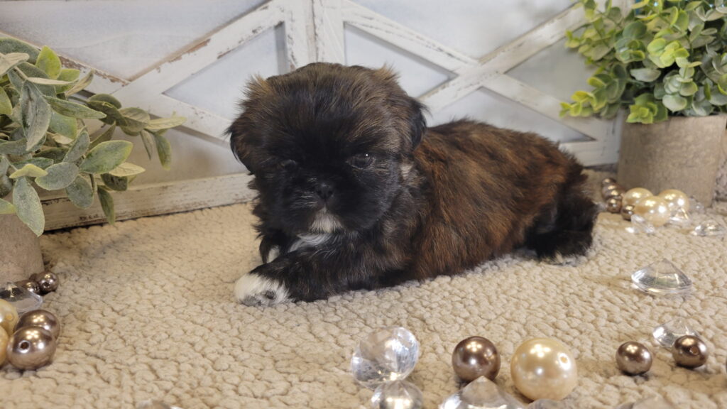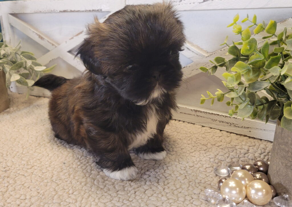 Butterball is a black-and-white male Shih Tzu with tall white socks and a white chest. Expected to reach 10-16 pounds, he’s irresistibly charming.