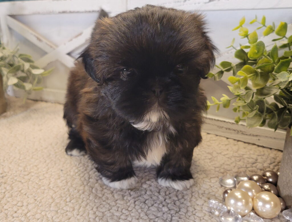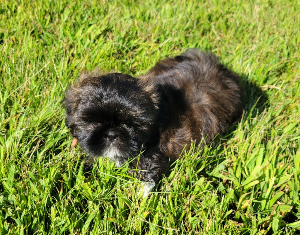 Bella is a lively and adventurous little Shih Tzu who never let her smaller size slow her down. She held her own with all her brothers, proving herself to be both playful and confident. Wrestling and chewing toys are her favorite ways to burn off energy, and she brings a cheerful spark to any playtime.